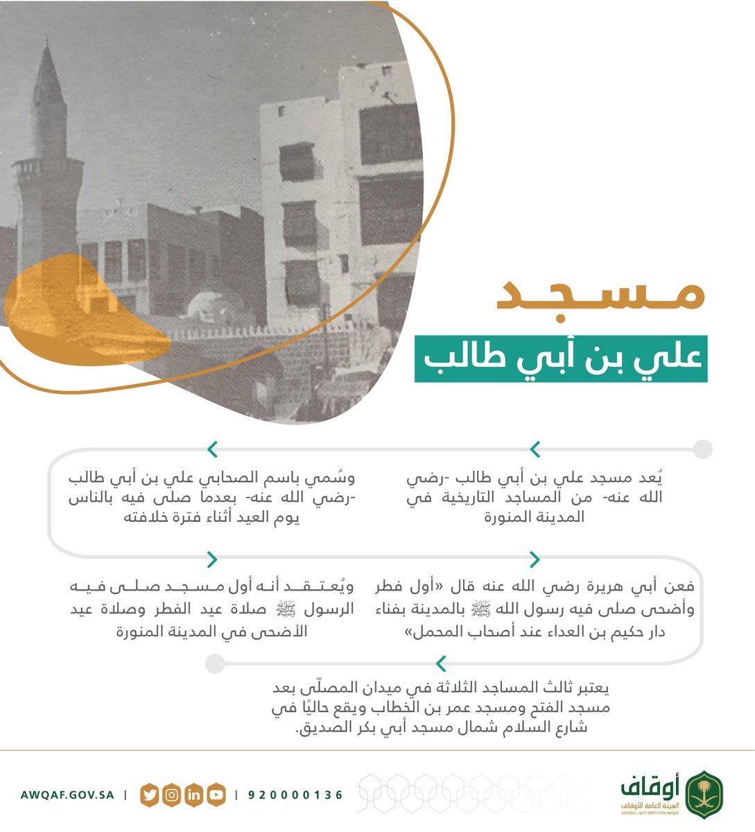 بالقرب من مسجد أبي بكر الصديق، يقع مسجد علي بن أبي طالب، حيث صلى الرسول ﷺ أول عيدين له بالمدينة، وهو من #أوقاف_المدينة_التاريخية.. فما هي قصته؟📋