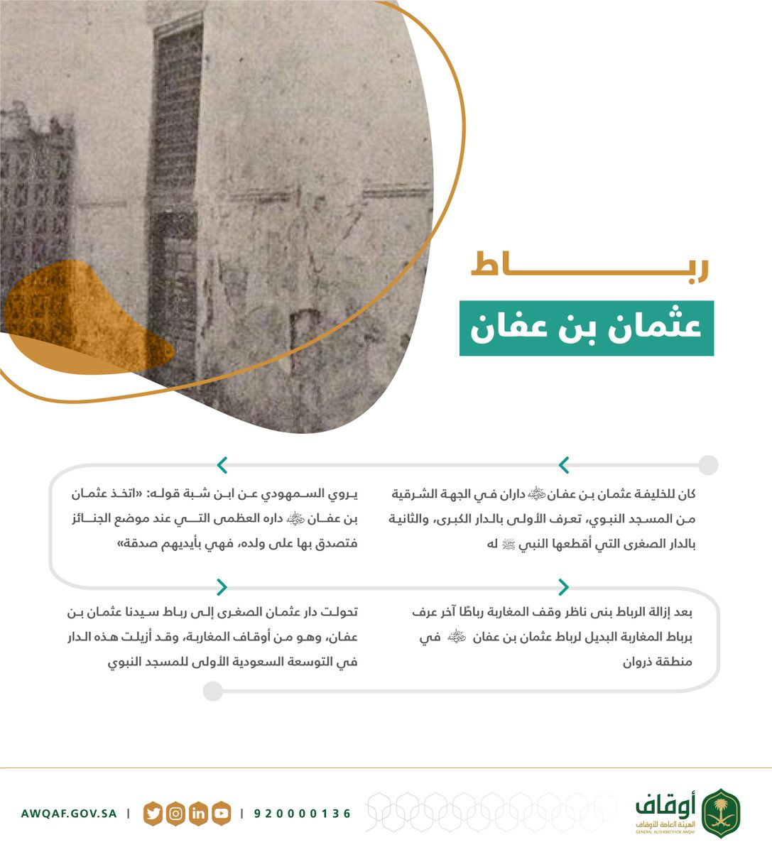 كان للخليفة عثمان بن عفان رضي الله عنه داران بالقرب من #المسجد_النبوي تحولت إحداهما إلى رباط عثمان؛ الذي يُعتبر من #أوقاف_المدينة_التاريخية ..