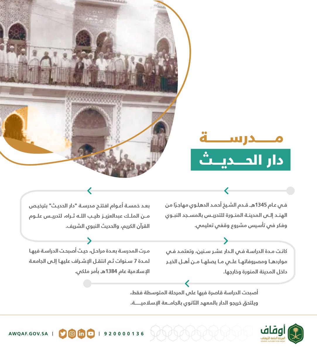 عبر التاريخ الإسلامي؛ مثلّت المدارس والمكتبات منتجات وقفية يسارع إلى تأسيسها الواقفون، ابتغاءً لمرضاة الله ولتعظيم أثر الأوقاف في المجتمعات، ومنها مدرسة دار الحديث أحد #أوقاف_المدينة_التاريخية..