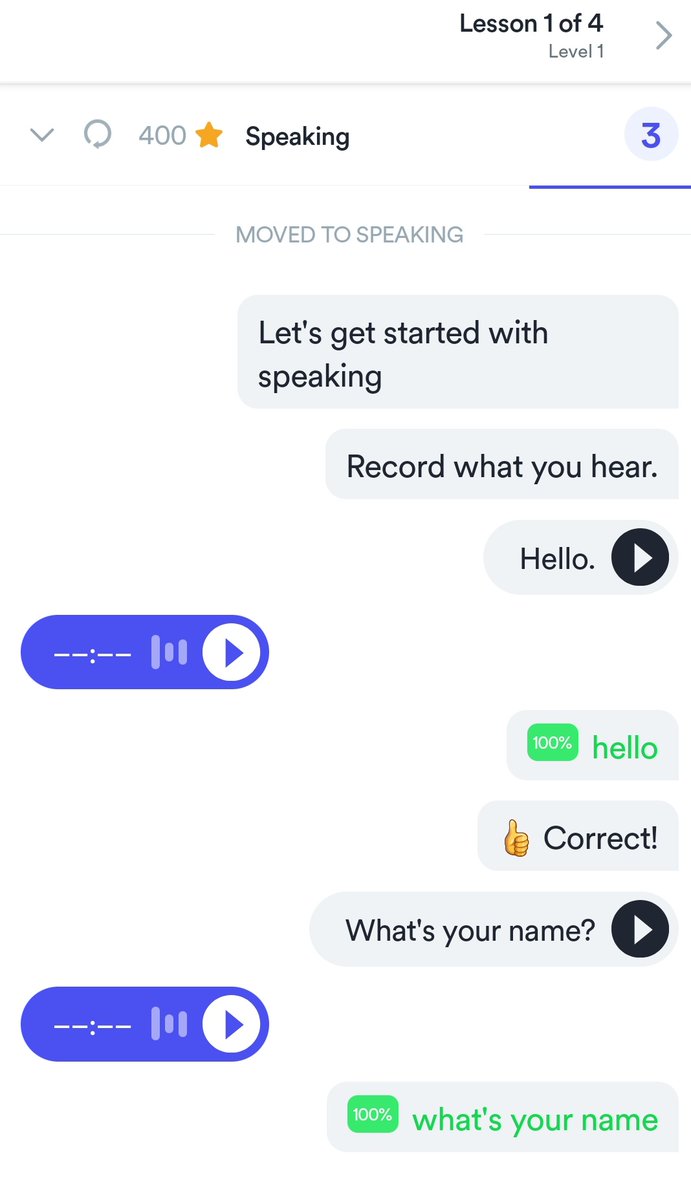 التمارين والأسئلة اللي يقدمها لك تغطي مهارات عديدة من ضمنها الإستماع والقراءة والتحدث .. كل ما جاوبت إجابة صحيحة تضاف لك نقاط بحسابك ويرد عليك بردود مشجعه جميلة ?❤