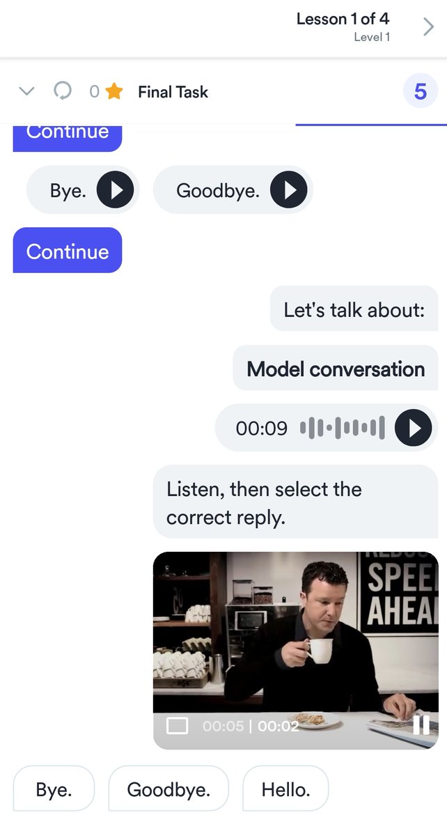 مثلاً بدروس المراحل الأولى يعلمك كيف تتواصل مع الناس وتخاطبهم بالطريقة الصحيحة، يعرضلك فيديو فيه النطق الصحيح للكلمات وانت تجاوب بناءً على ما تسمعه