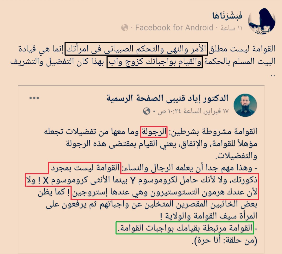 ظهر بعض الشّحارير الذين يفرقون -مثل الها.لك شحرور- بين الرجولة والذكورة باعتبارٍ غير البلوغ، فيقولون أن الذكر لا يستحق القوامة إلا إن كان رجلا، ويقصدون بالرجل هنا (الذي يتحمل المسؤولية وينفق ويسيطر ويكون حازما، ووو) ويختلف تعريفها من شخص إلى آخر.