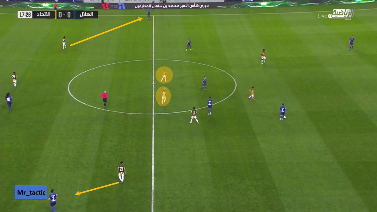 غياب عبد الله عطيف جعل الهلال يعتمدون بخط الوسط على سلمان الفرج وكويلار .. وجميعنا نعلم أن كويلار ليس بنفس جودة عطيف بالبناء الهجومي من الخلف وهذا ما جعل التركيز كله على عطيف مع تحركات جيوفنكو وإدواردو وسالم الدوسري وسقوطهم للخلف بحثاً عن الزيادة العددية
