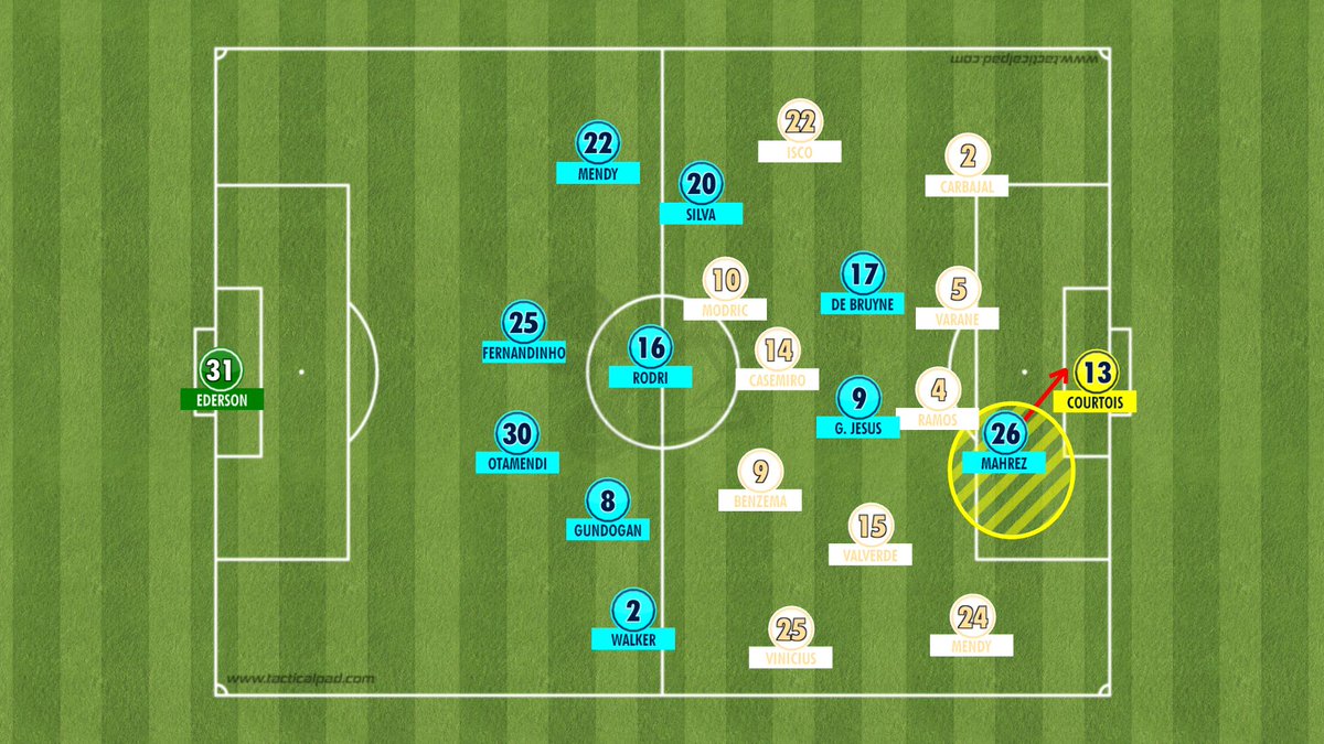 حسنا لنعود إلى عقل #غوارديولا: "علي أن أفتح الأجنحة لأن ريال مدريد سيضغط من أجل هدف ثان. سأدخل رحيم ستيرلينغ وأخرج سيلفا صاحب الأدوار الدفاعية اليوم، وبالتالي سأحصل على أطراف أقوى وأكثر حركية"