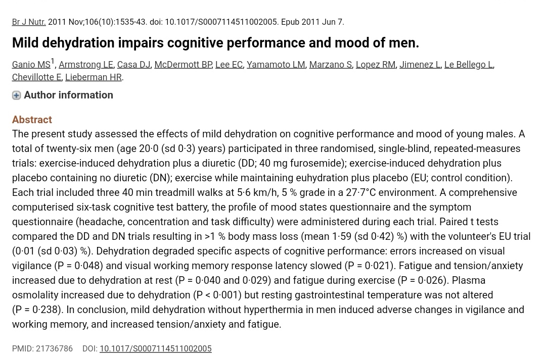 أظهرت العديد من الدراسات أن التعرض للجفاف حتى بشكل معتدل يمكن أن يؤدي إلى انخفاض مستويات الطاقة وانخفاض القدرة على التركيز