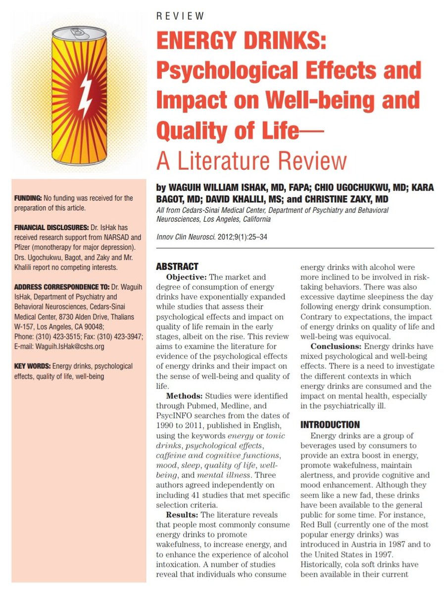 وجدت مراجعة علمية ل 41 دراسة أنه على الرغم من أن مشروبات الطاقة أدت إلى زيادة اليقظة وتحسين الحالة المزاجية لعدة ساعات بعد الاستهلاك، إلا أن النعاس الشديد أثناء النهار كان يحدث غالبًا في اليوم التالي