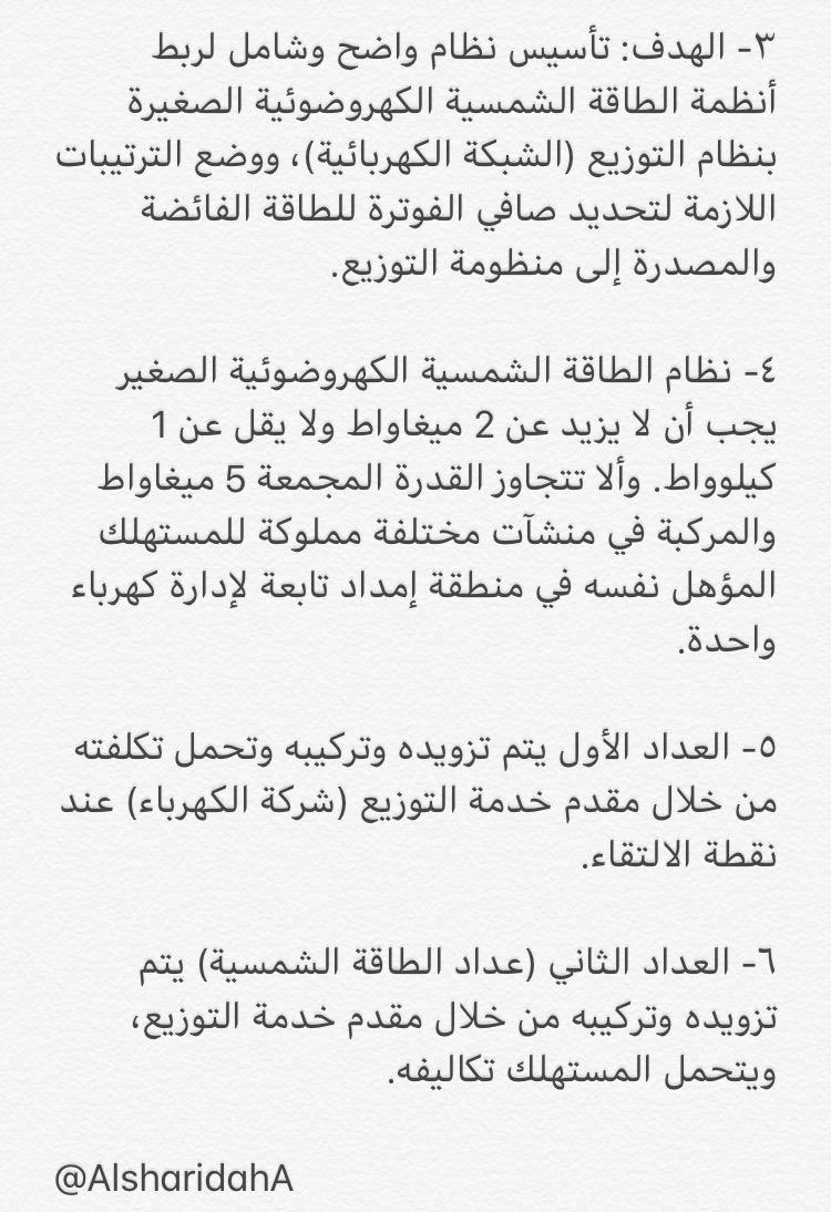 بعد التعديل الجديد على الوثيقة سيكون النظام المستخدم هو صافي الفوترة Net Billing حيث يتم تصدير #الطاقة_الشمسية الفائضة والمولدة إلى منظومة التوزيع وتسجيلها في نظام الفوترة كرصيد مالي حدد بـ 7 هللات / ك واط ساعة لفئة السكني.