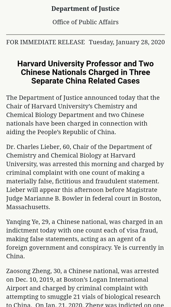في تاريخ 28 جانيوري من هذا العام، كشفت وزارة العدل الامريكية عن اعتقال البروفسور شارلز ليبار في جامعة هارفرد والذي تلقى ملايين الدولارات من جامعة في الصين لنقل بعض التقنيات البيولوجية، فهذا التوقيت يثير العديد من التساؤلات عن ارتباط عملية القبض بفيروس #كورونا.
