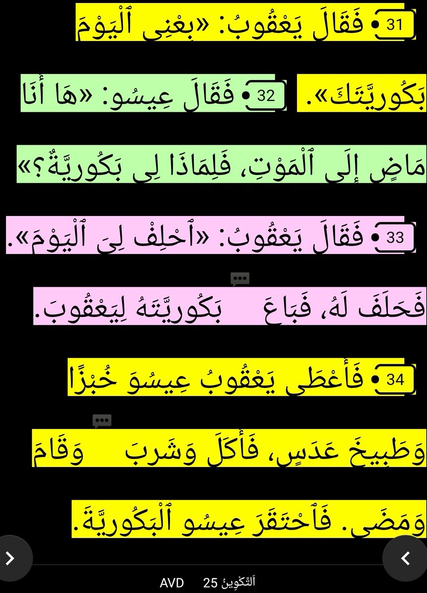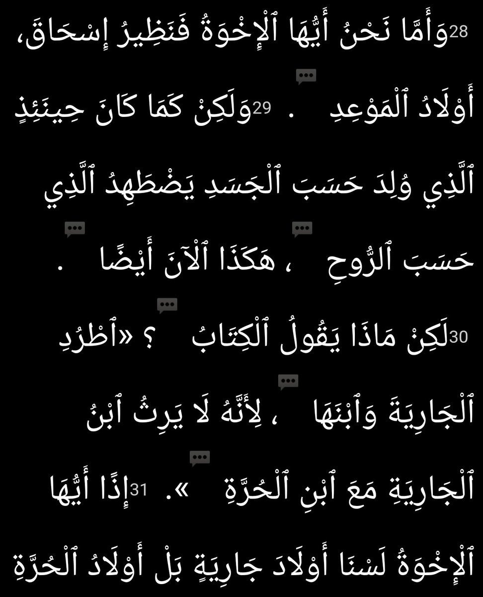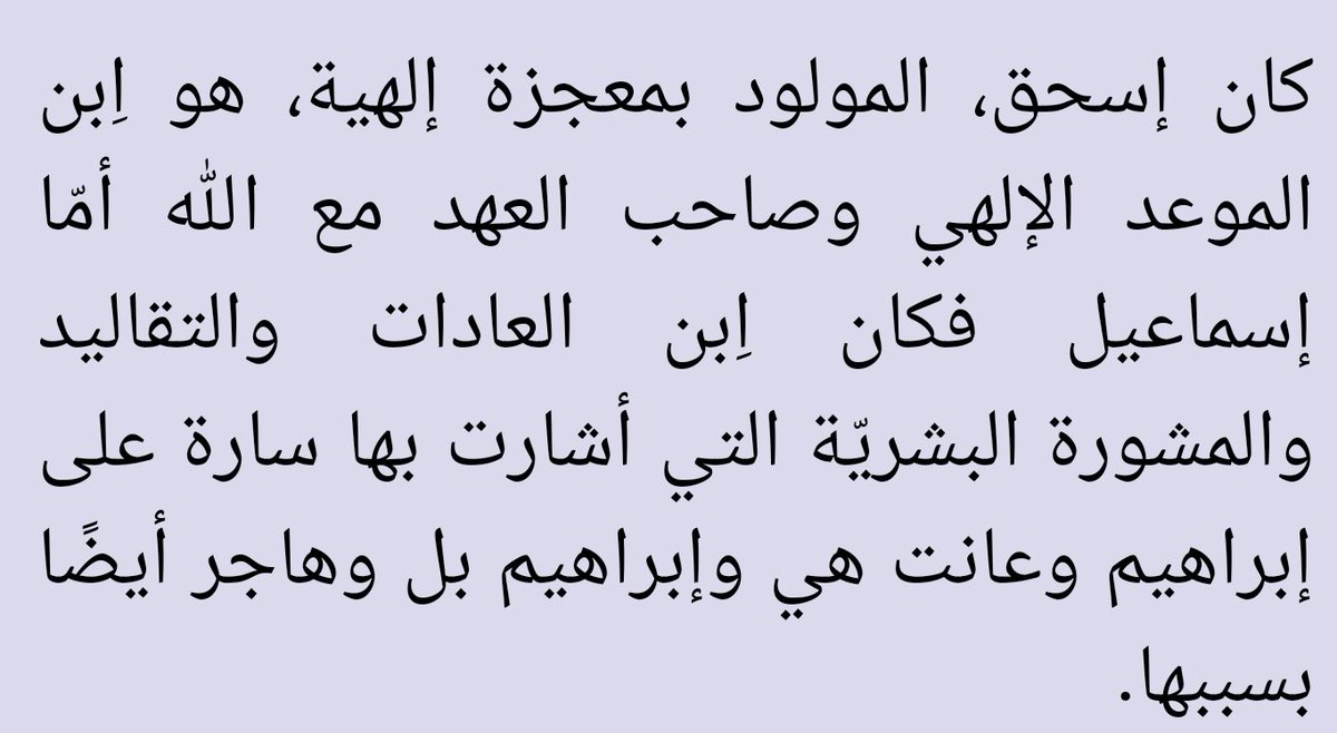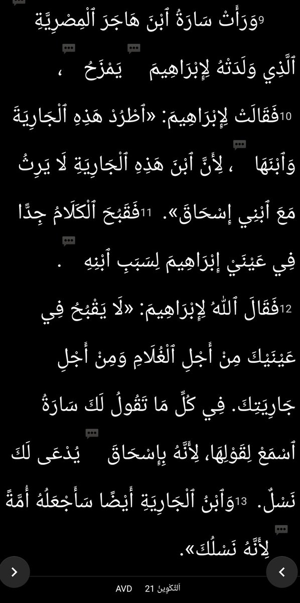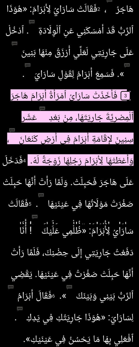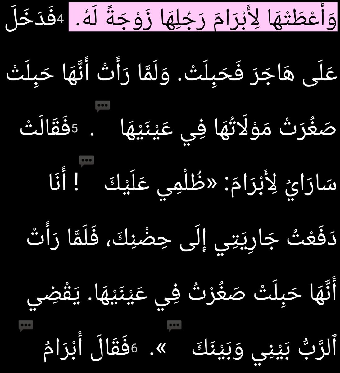 الكتاب يقول أن سارة أعطت هاجر لابراهيم رجلها زوجة له، يعني هي كانت جارية عند سارة لكن لم تكن جارية لابراهيم بل زوجة، والكتاب يؤكد أنه إذا اتخذت جارية لك زوجة فهي زوجة ولا يحق للرجل بيعها أو استرقاقها 🙂 نعتذر عن الإطالة @Rattibha