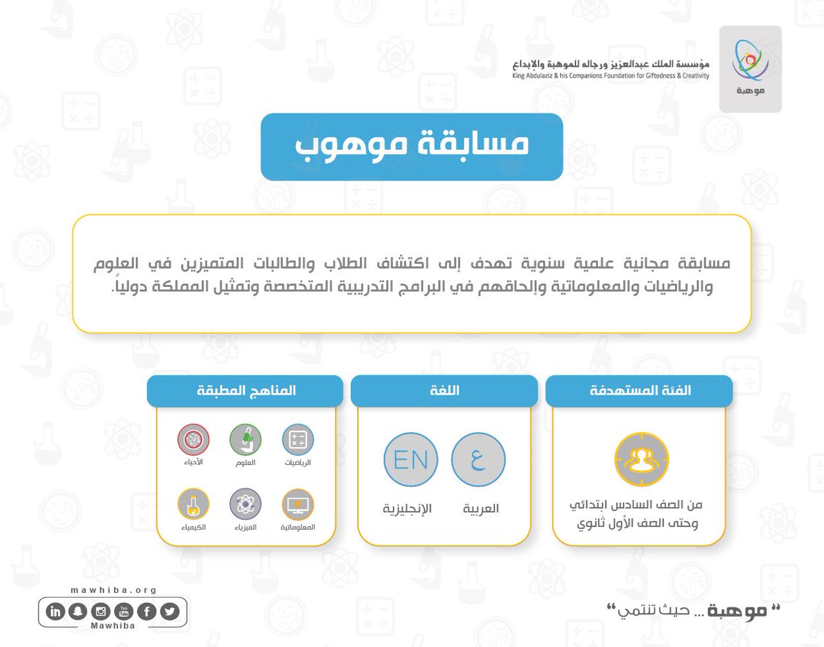 #الرياضيات و #العلوم شغف يمكن تنميته معنا عبر #مسابقة_موهوب_للرياضيات_والعلوم السنوية المجانية التي تهدف إلى تعزيز مهارات أبنائنا في هذه المجالات وفرصةلتمثيلهم #الوطن?? دوليًا بمسابقات #الأولمبياد_الدولي المتنوعة