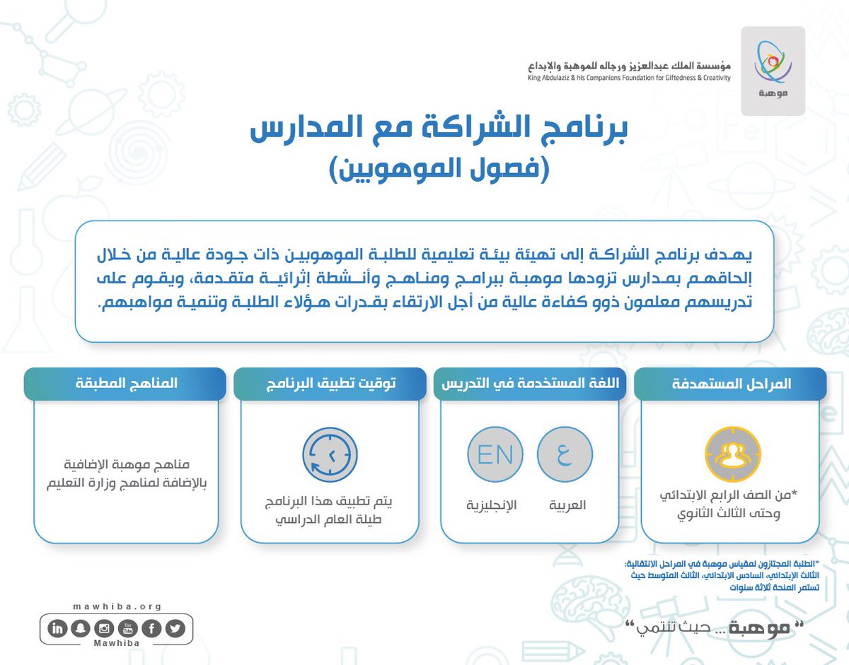 ?| يرشح #البرنامج_الوطني_للكشف_عن_الموهوبين أبناءنا الموهوبين للالتحاق بـ #مدارس_الشراكة حيث توجد فصول الموهوبين بمناهج متقدمة متخصصة في مجالات #العلوم و #الرياضيات و #اللغة_الإنجليزية و #تقنية_المعلومات mawhiba.sa