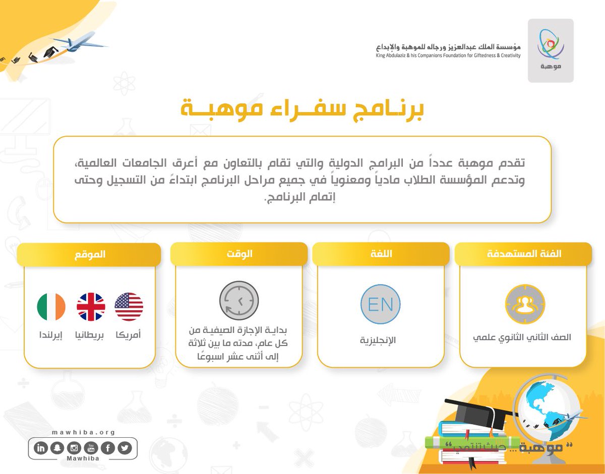 يتيح لك #البرنامج_الوطني_للكشف_عن_الموهوبين الالتحاق بـبرنامج #سفراء_موهبة بالتعاون مع أعرق الجامعات العالمية خلال فترة الإجازة الصيفية لتعزيز شغفك ببرامج متقدمة في مجالات العلوم والتقنية✨