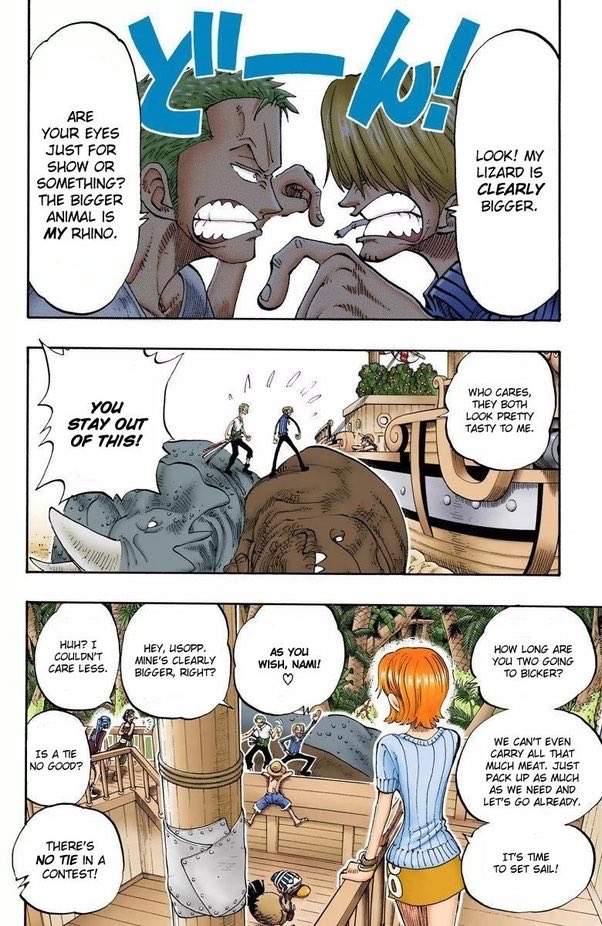 استطاع سانجي عرقلة اورز صاحب البدن الضخم وبالغ القوة وإسقاطه عن طريق ركل رجله.