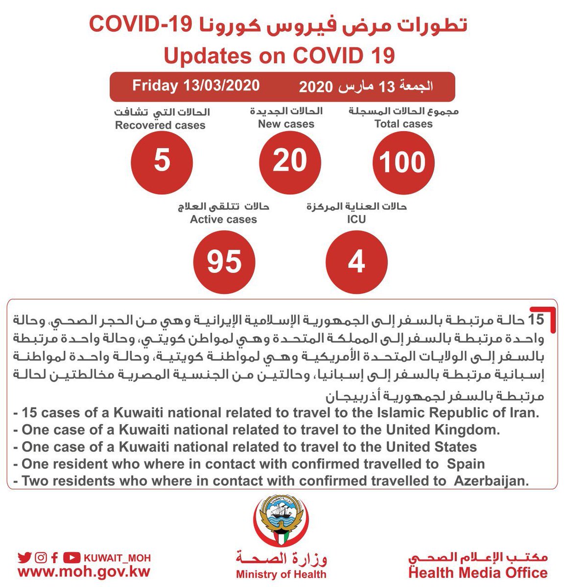 من بين الحالات الجديدة هناك 17 حالة لقادمين من (مصر - المغرب - بريطانيا - إسبانيا - إيران - أمريكا - الكويت - العراق - الهند - باكستان).