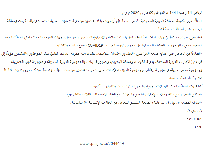 🚨🚨🚨 السعودية تفرض حالة حظر التجول بشكل رسمي للحد من انتشار كورونا.