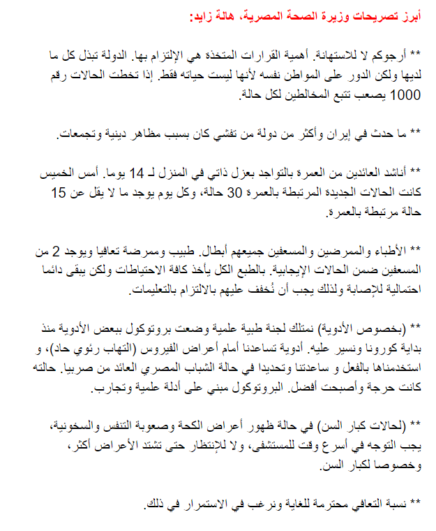 وزارة الصحة المصرية كشفت إن هناك 4 محافظات سجلت انخفاضا ملحوظا في معدل الإصابات الجديدة في آخر أسبوعين "بسبب وعي المواطنين والتزامهم".