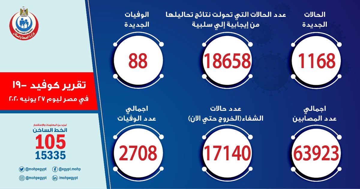 عدد الحالات في مصر وصل 60 حالة "من بينهم 27 حالة تحولت تحاليلهم من إيجابية لسلبية - مرحلة من التعافي-"