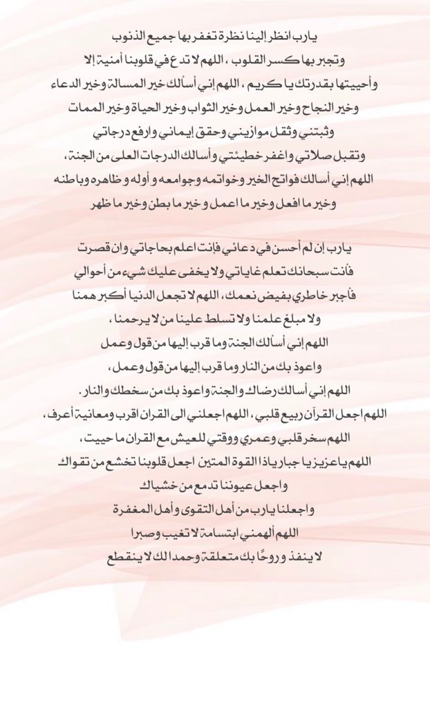 اللهم ارزقنا راحه البال وصلاح الحال والفوز بالجنان والعتق من النيران وأتم علينا نعمة الأمن والأمان اللهم يا جبار ياقادر يا رحمن أشف مرضانا وأرحم موتانا وعافي مبتلانا وأهد ضالنا ارفع البلاء والوباء وسيء الأسقام برحمتك وقدرتك