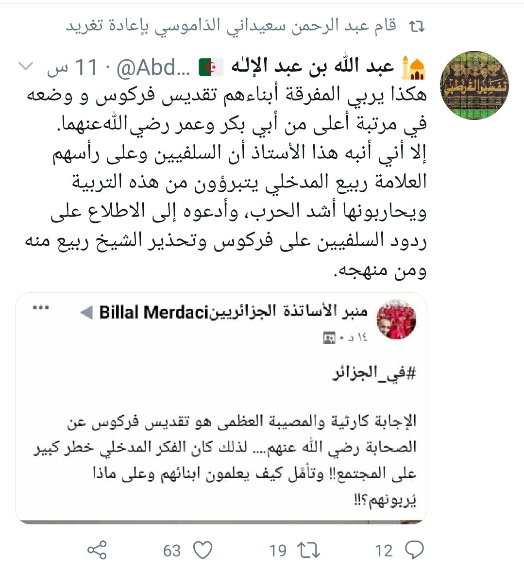 ٢- قول أحدهم: "إن كان فركوس أعلم بواقع الجزائر ، فالشيخ ربيع أعلم بواقع العالم كله"