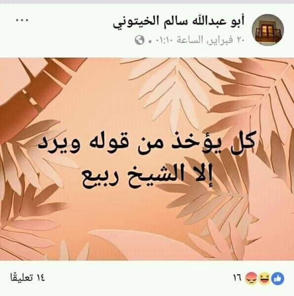 ٦- قول أبي عبد الله سالم الخيتوتي الليبي: " كل يؤخذ من قوله ويرد إلا الشيخ ربيع "_كذا على الإطلاق