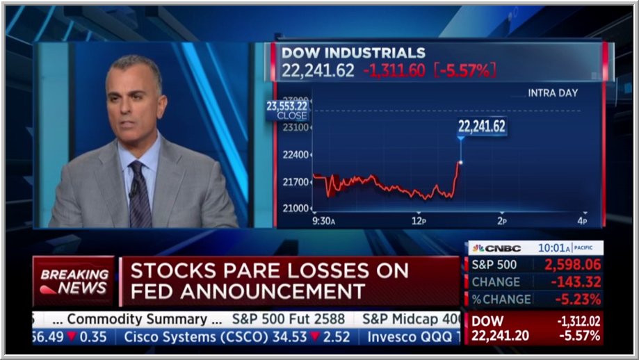 داوجونز على تذبذب عالي .. وهو الآن على تراجع 1400 نقطة ، وقد كان قبل حوالى ساعة على تراجع 2200 نقطة ، وفور اعلان الفدرالي عن التدخل في السوق المفتوح وضخ 500 بليون دولار للنظام البنكي قلص داوجونز جسائره الى 800 نقطة فقط