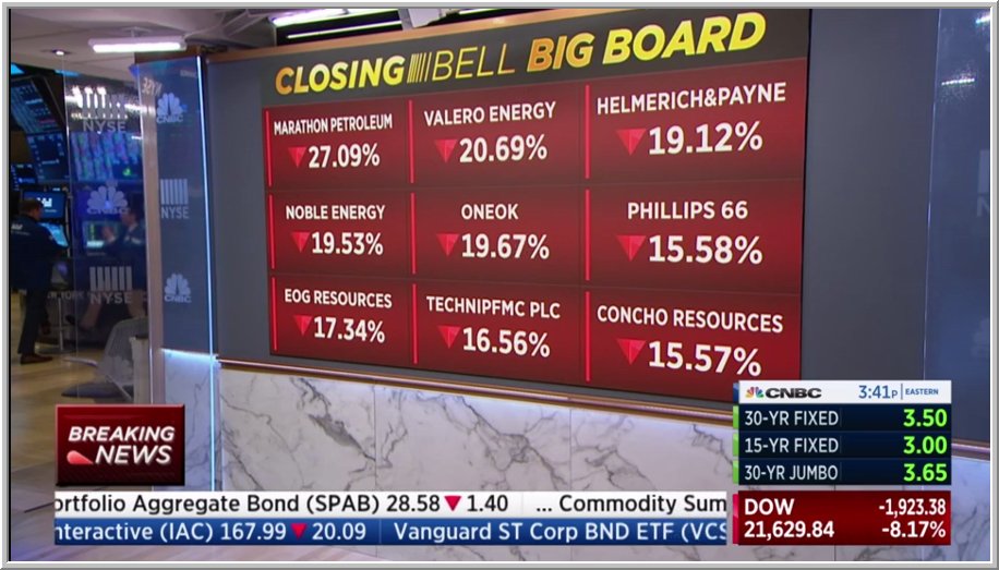 يونايتد ايرلاين $UAL ، تراجع 23%، فاليرو النفطية $VLO تراجع 21%، الكوا للألومنيوم $AA تراجع 21%، دلتا ايرلاين $DAL هبوط 20% ، بوينج $BA هبوط 14% ، $IBM وديزني هبوط 13%