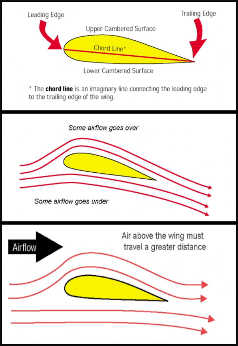 لاحظ ان المسافة التى يقطعها الهواء اعلي الجناح أكبر من المسافة التي يقطعها أسفله .. ولقد قام المهندسون ببناء الجناح بهذا الشكل حتي يجعلوا الهواء المار أعلى الجناح يقطع مسافة أطول من الهواء المار أسفله....