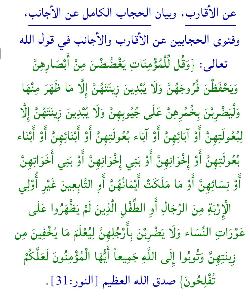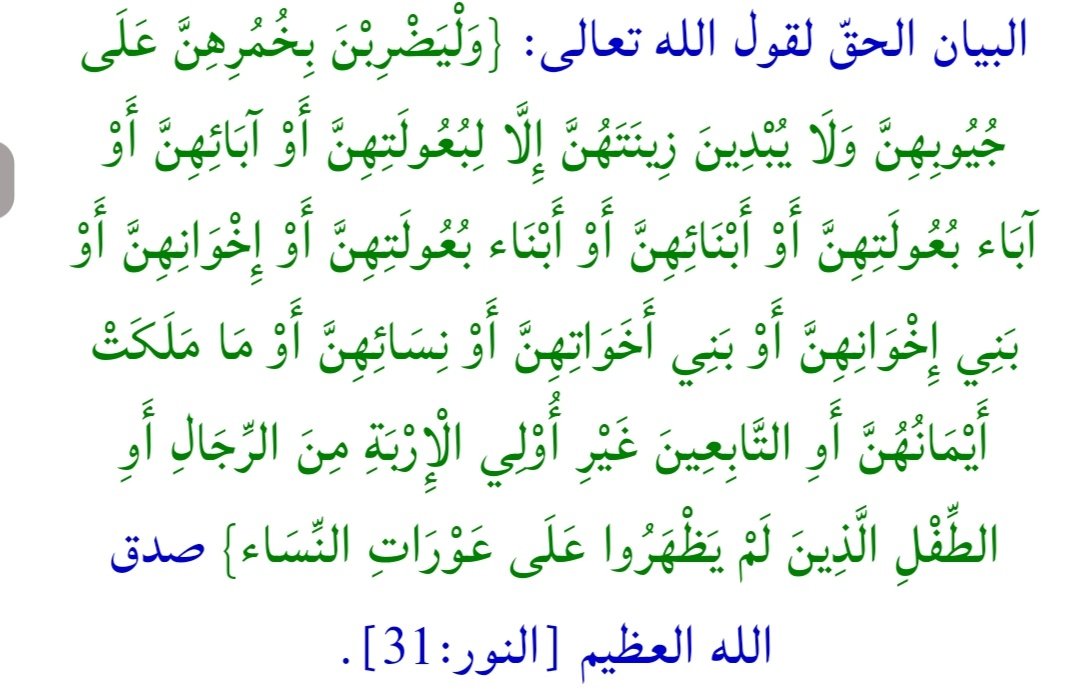 @saudfozan1 @nasserhiloo 1_ وإلى البيان الحقّ، وقال الله تعالى: {وَلَا يُبْدِينَ زِينَتَهُنَّ إِلَّا مَا ظَهَرَ مِنْهَا} صدق الله العظيم، والسؤال الذي يطرح نفسه: فما المقصود بقول الله تعالى: {إِلَّا مَا ظَهَرَ مِنْهَا}؟ والجواب: إنهُ وجه المرأة وكفيها وقدميها وذلك حجاب المرأة أمام الأقارب.