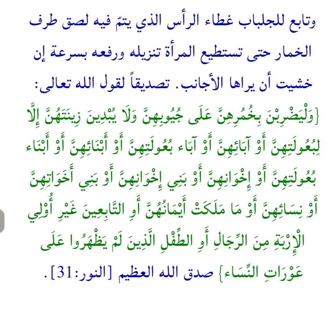@saudfozan1 @nasserhiloo 7_تصديقاً لقول الله تعالى: {وَلَا يُبْدِينَ زِينَتَهُنَّ إِلَّا مَا ظَهَرَ مِنْهَا وَلْيَضْرِبْنَ بِخُمُرِهِنَّ عَلَى جُيُوبِهِنَّ}، وإنما تضرب بخمارها على وجهها وعنقها حين رؤية الأجانب فسرعان ما يغطي الخِمار وجهها وعنقها فتضرب به على الصدر فوراً حين رؤية الأجانب،