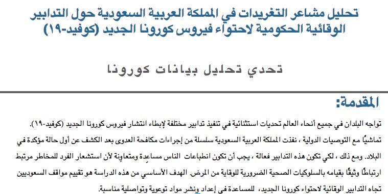 سلّمنا اليوم مشاركتنا في #تحدي_كوفيد١٩ لتحليل تفاعل السعوديين في تويتر تجاه التدابير الحكومية للحد من كورونا. حللنا ٥٤ ألف تغريدة باستخدام الذكاء الاصطناعي لتحليل المشاعر sentiment analysis سننشر البحث قريبا؛ فالنا الفوز 🎉🙏🏻 @aakhalifah @AljubranJabs