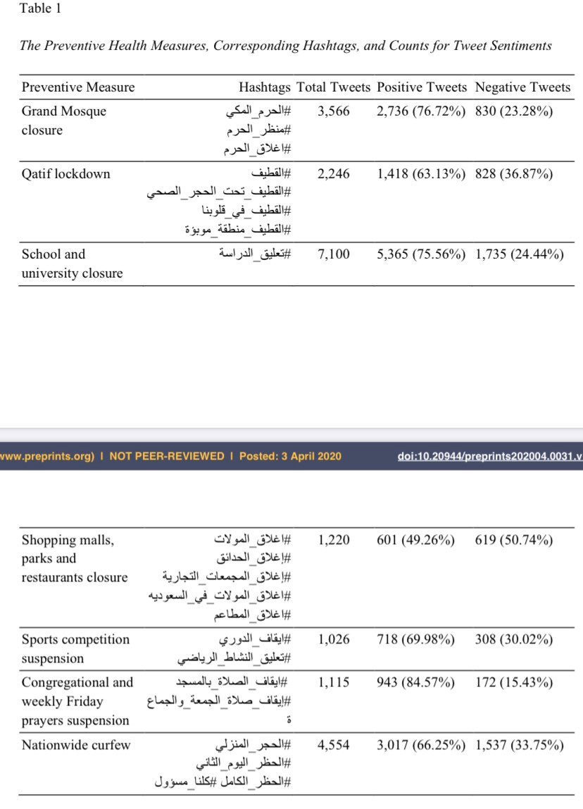 تم نشر بحثنا اليوم والذي درسنا فيه تجاوب السعوديين مع الإجراءات الحكومية لصدّ كورونا. استخدمنا فيه منهجية "ذكية" لتحليل آلاف التغريدات.. قراءة ممتعة.. وأرجو من الزملاء الباحثين مراسلتي بقراءتهم النقدية لتحسين البحث وتسليمه للتحكيم. شكرا لفريق العمل الرائع preprints.org
