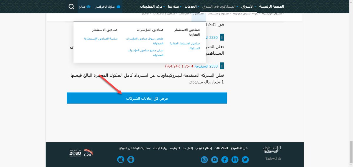 6⃣1⃣ الآن ندخل ملف الشركة في موقع تداول ونضغط على عرض كل إعلانات الشركة ونبحث عن التواريخ التي حصلنا عليها من الموقع السابق وتتضمن اعلانات زيادة رأس المال للشركة tadawul.com.sa