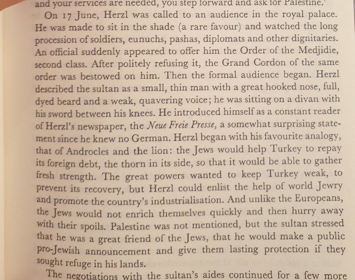 في ١٧ يوليو ١٩٠١ اجتمع هيرتزل مع السلطان عبدالحميد الثاني. اللقاء كان اخوي و قال السلطان انه صديق لليهود. هيرتزل عرض تسديد ديون الدولة العثمانية و ايضا قيام اليهود بتحويل تركيا لدولة صناعية محترمة.