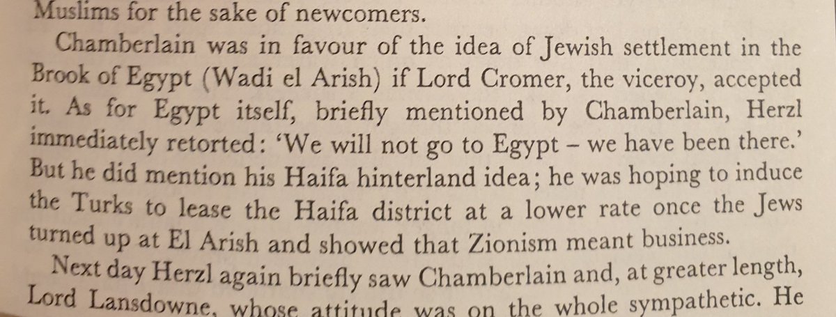 اجتمع هيرتزل في بريطانيا ١٩٠٢ مع عضو البرلمان شامبرلين، و عرض عليه مشروع استيطان اليهود في سيناء في مثلث العريش. لكن شامبرلين قال ان هناك شرط موافقة حاكم مصر البريطاني اللورد كرومر.