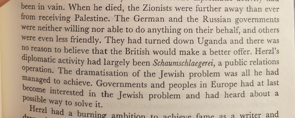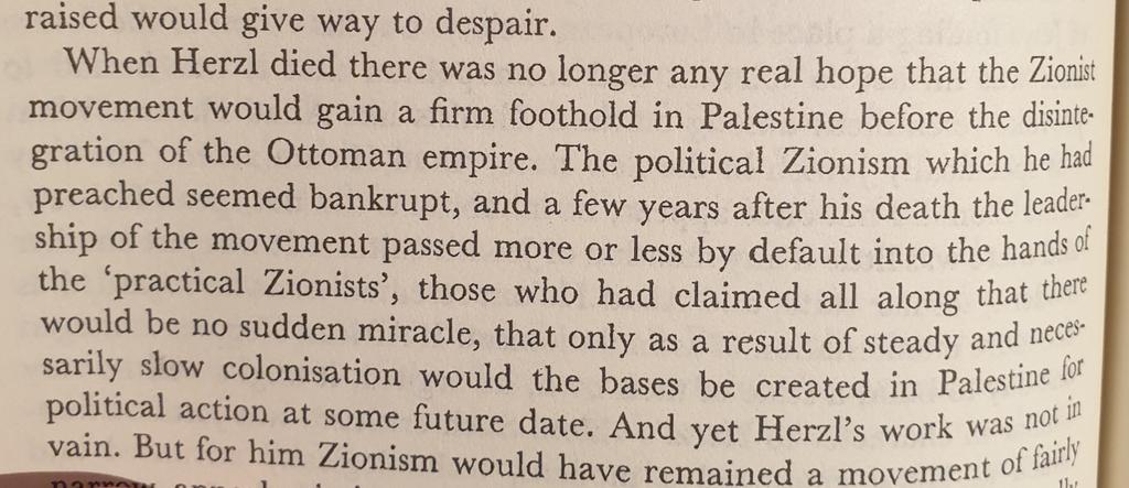 عند وفاة هيرتزل لم يكن هناك اي مشروع على الارض للحركة الصهيونية و القوى الكبرى مثل المانيا و روسيا و بريطانيا غير مهتمين بالقضية.