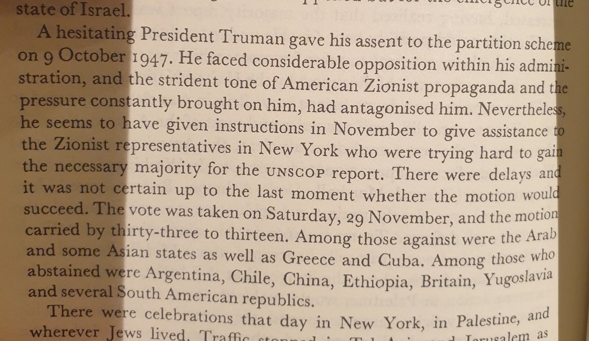 في النهاية الرئيس ترومان كان تحت ضغط اللوبي اليهودي و استسلم له و خالف توصيات المسؤولين الامريكان صوتت الولايات المتحدة على التقسيم.