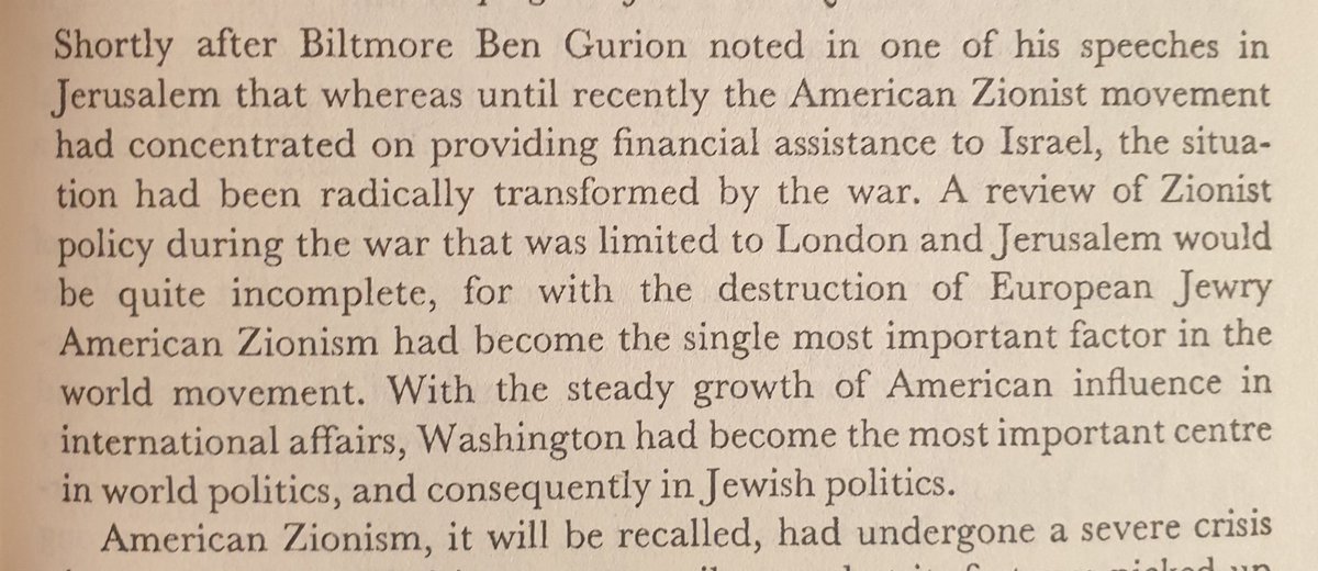 بداية الحرب استشعر بن غوريون ان القوى الدولية اصبحت تميل للولايات المتحدة. و ان امريكا هي القادرة على تحقيق حلم الدولة اليهودية. على العكس وايزمان الى الان متمسك ببريطانيا كقوة عالمية و انها ستحقق الحلم.