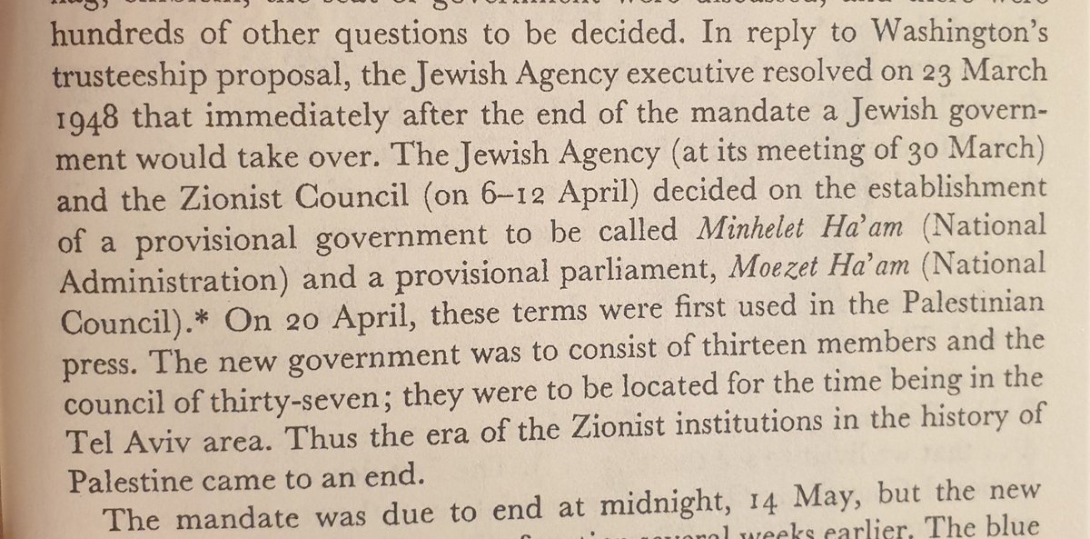 ٣٠ مارس ١٩٤٨ دعت الوكالة اليهودية لاجتماع، لتشكيل حكومة يهودية رسمية. الموافق ٢٠ ابريل تم تأسيس الحكومة الانتقالية اليهودية رسميا، و هنا انتهت رسميا دور الحركة الصهيونية.