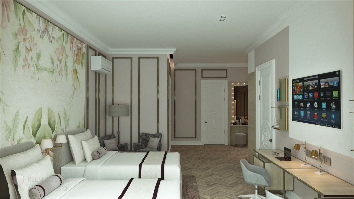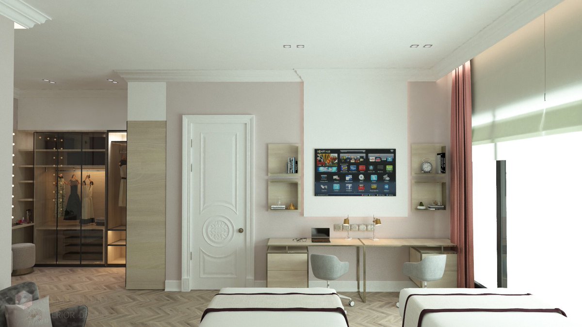 تصميم غرفة النوم لبنات ؛ تم التصميم وتوزيع الأثاث حسب احتياجاتهم من مكتب للمذاكرة وتلفزيون وجلسة بسيطة 👌🏻