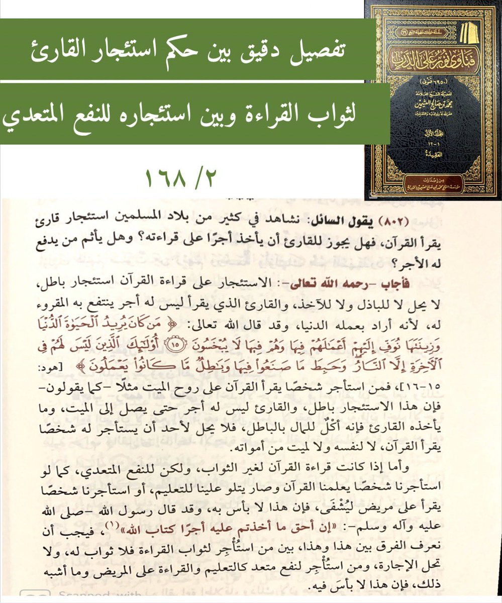 تفصيل دقيق بين حكم استئجار القارئ لثواب القراءة، وبين استئجاره للنفع المتعدي.