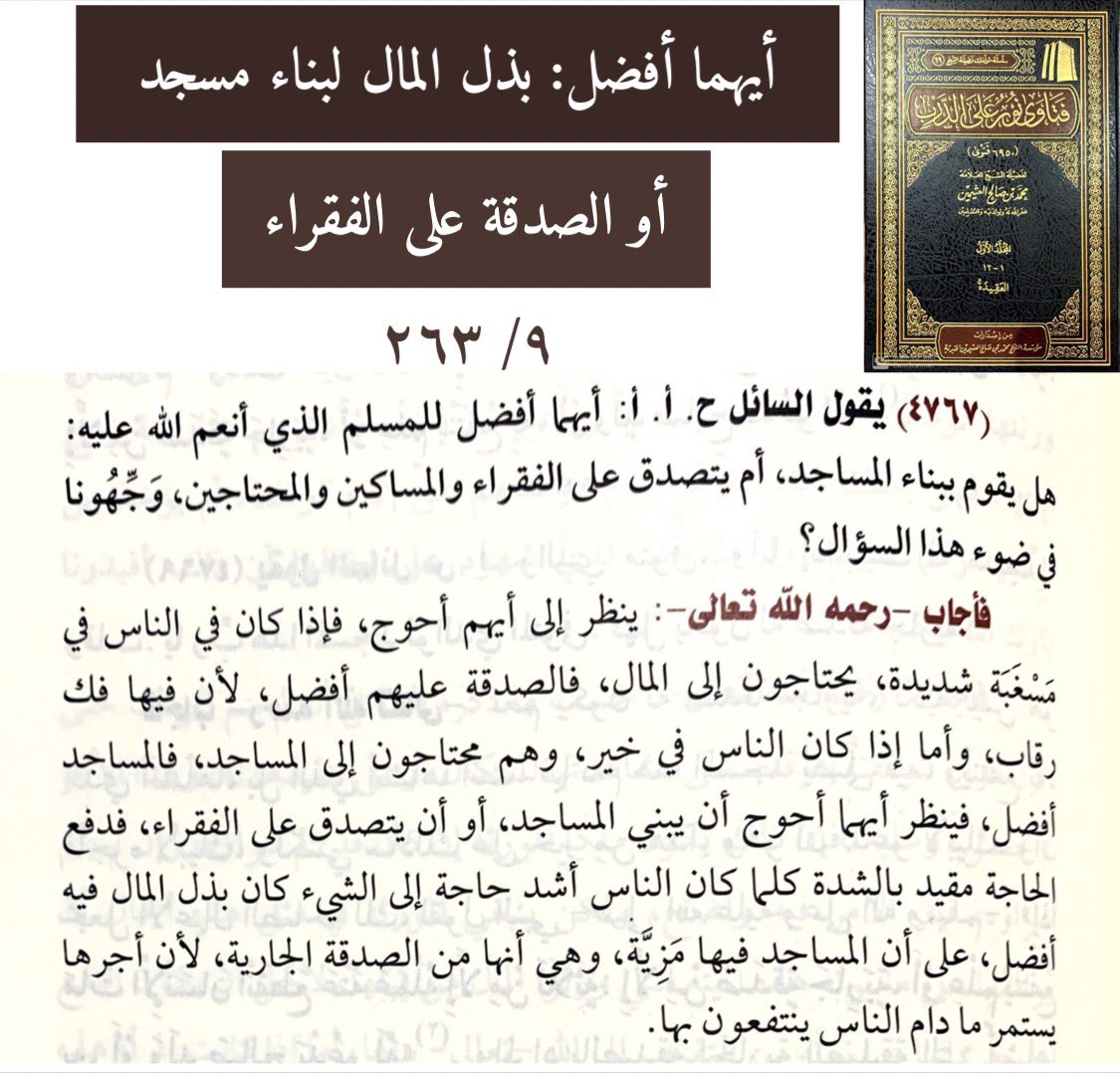 أيهما أفضل: بذل المال لبناء مسجد، أو الصدقة به على الفقراء؟