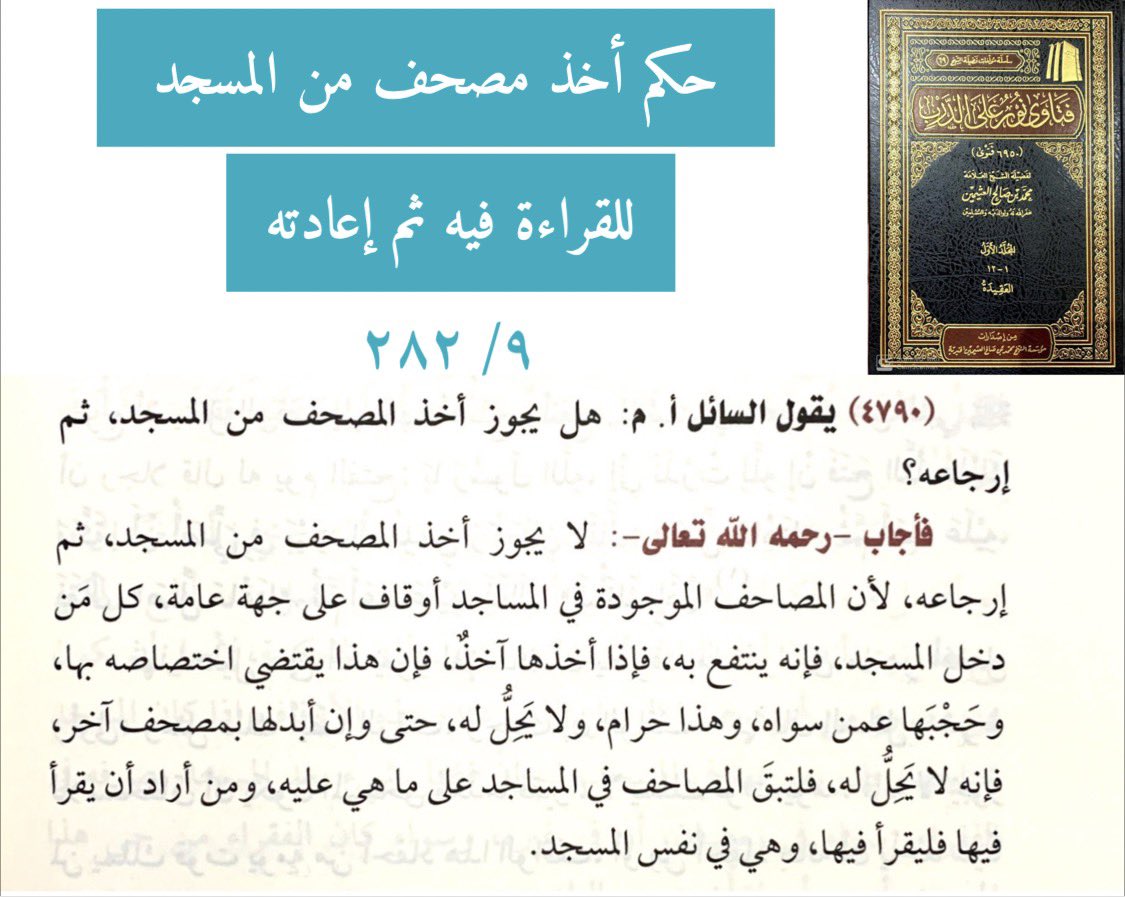 حكم أخذ مصحف من المسجد للقراءة فيه ثم إعادته.