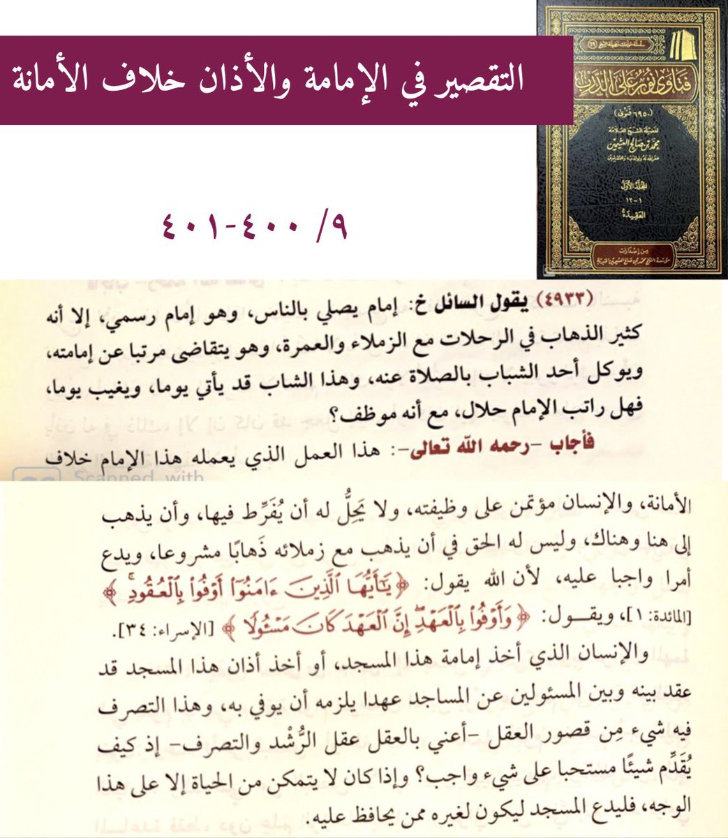 التقصير في الإمامة والأذان خلاف الأمانة.