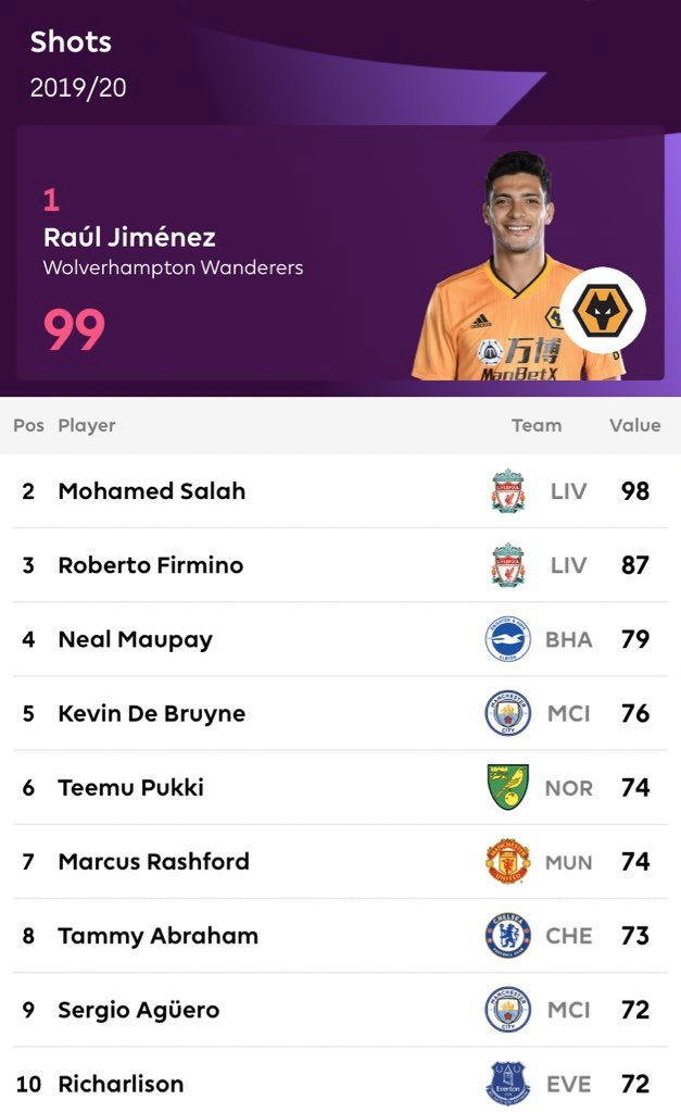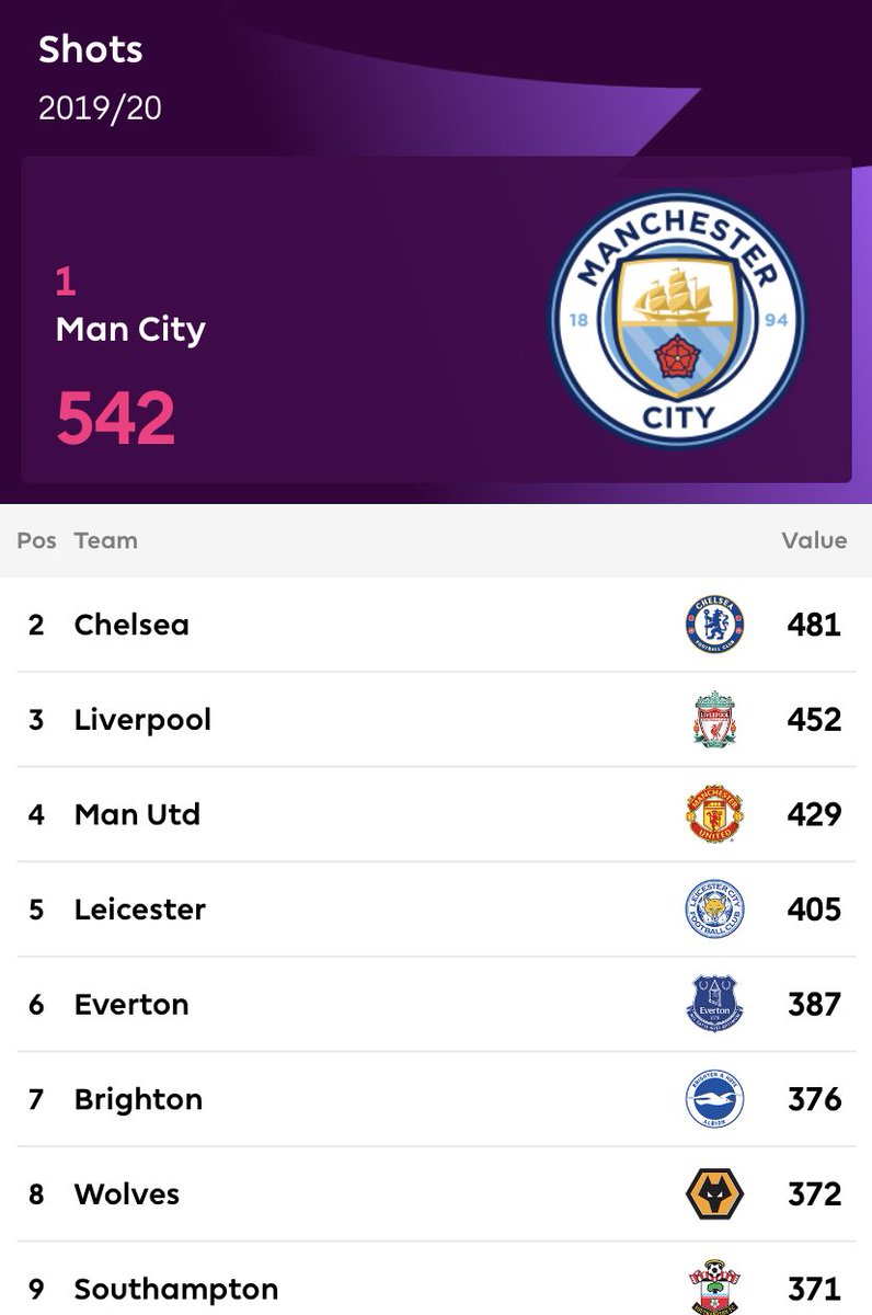 اكثر فرق تسديدا للكرة في البريميرليغ موسم 2019-2020 حتى الان /