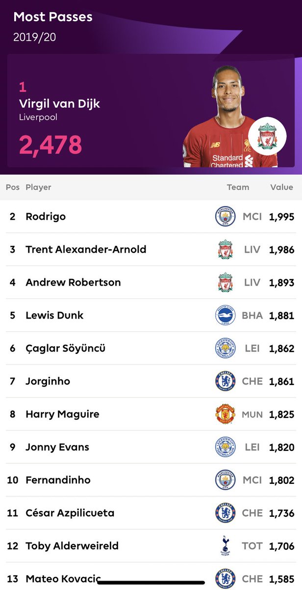 اكثر اللاعبين تمريرا للكرة في البريميرليغ موسم 2019-2020 حتى الان /