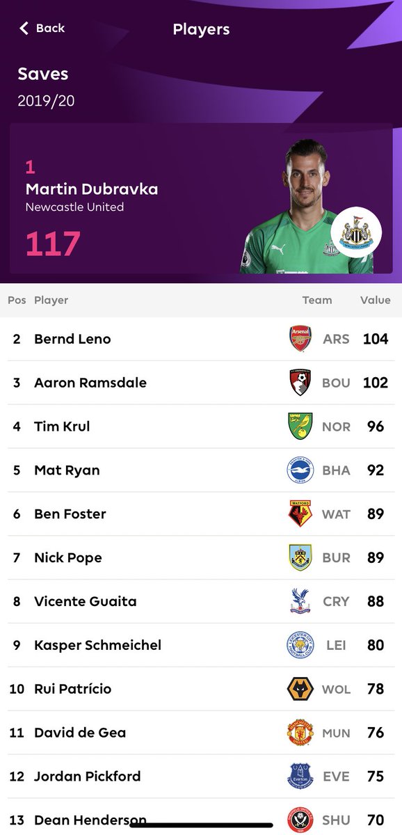 اكثر الحراس تصديا للكرة في البريميرليغ موسم 2019-2020 حتى الان /