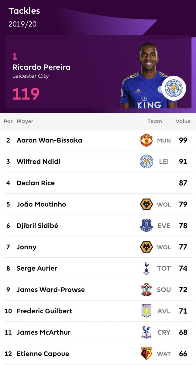 اكثر اللاعبين افتكاكا للكرة في البريميرليغ موسم 2019-2020 حتى الان /