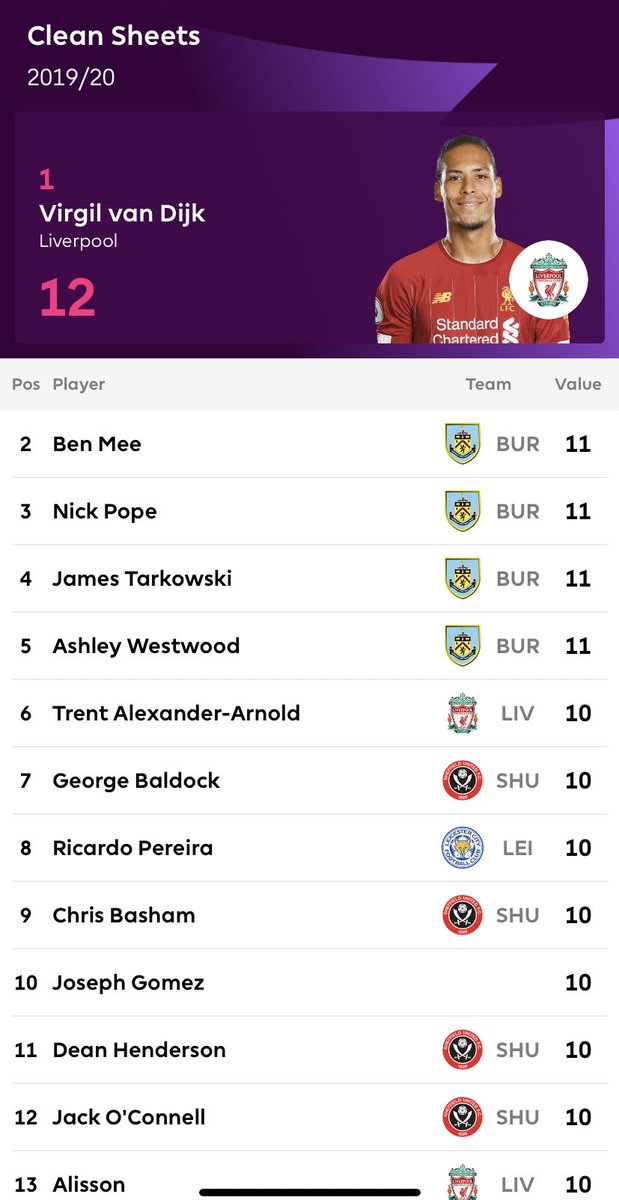اكثر لاعبين خروجا بالكلين شيت في البريميرليغ موسم 2019-2020 حتى الان /