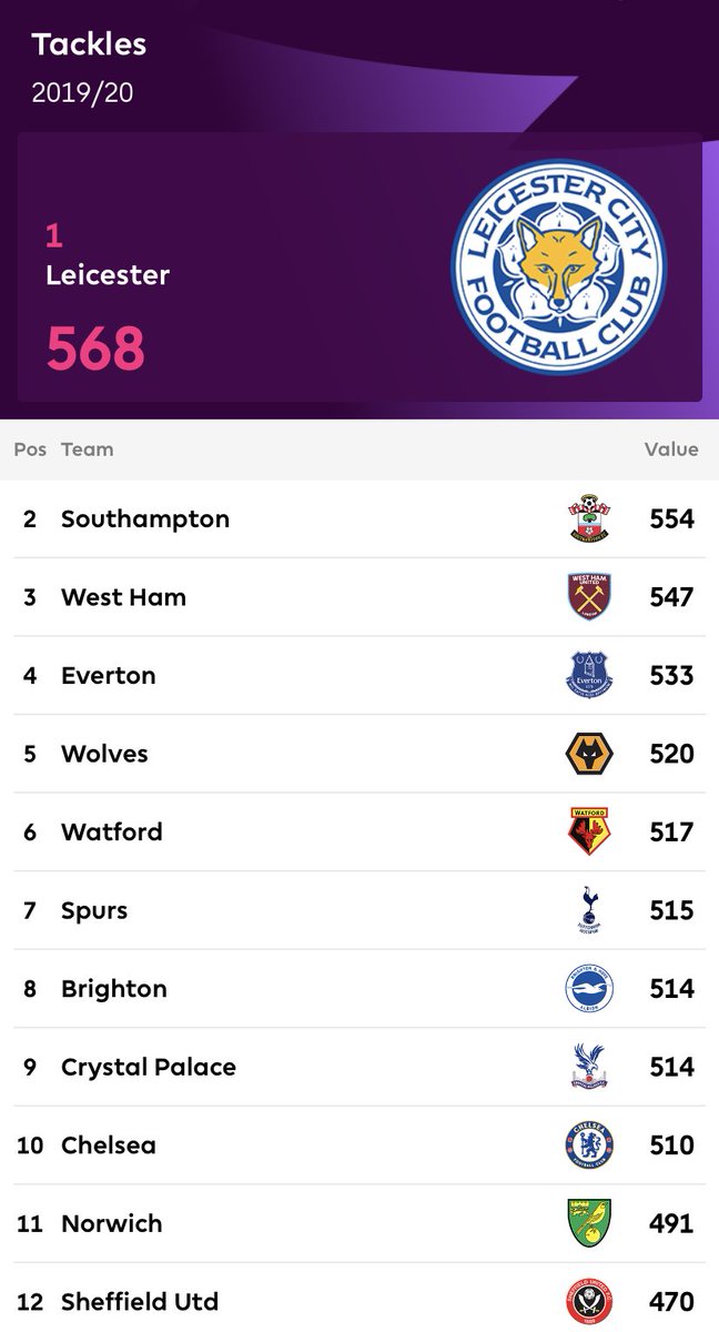 اكثر الفرق تخليصا للكرات في البريميرليغ موسم 2019-2020 حتى الان /