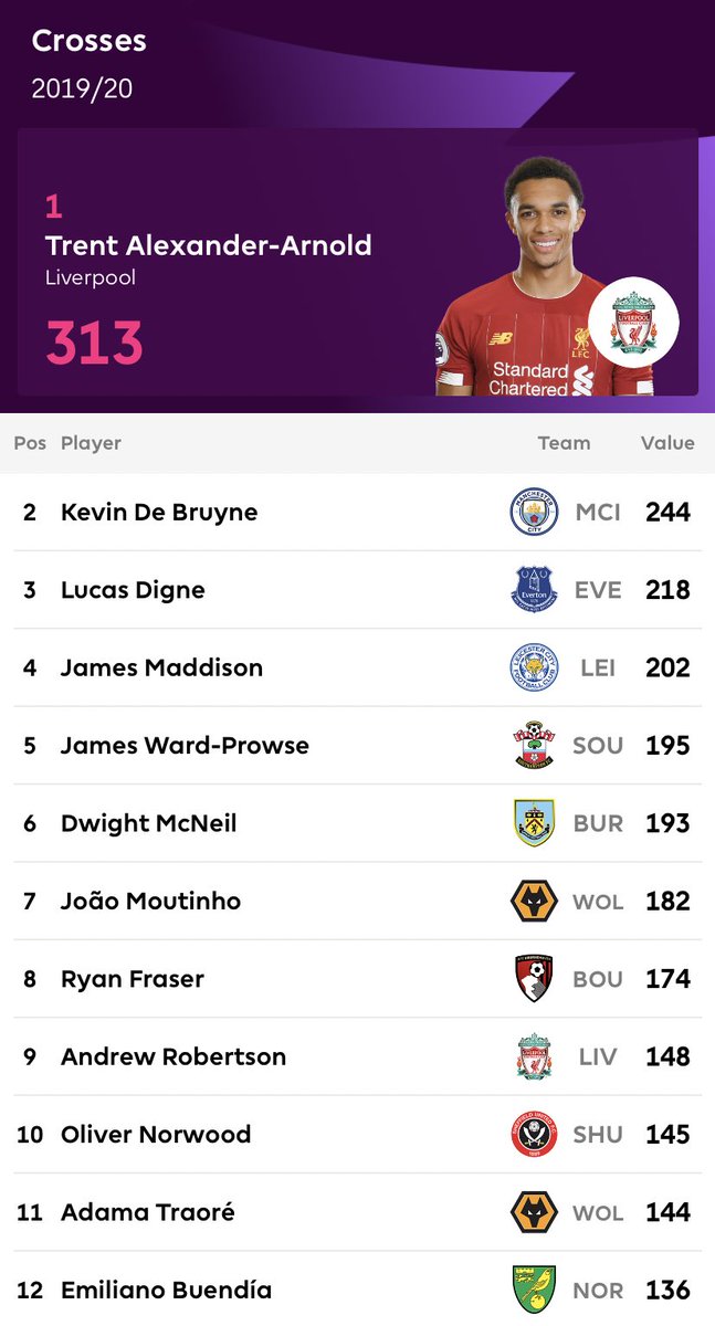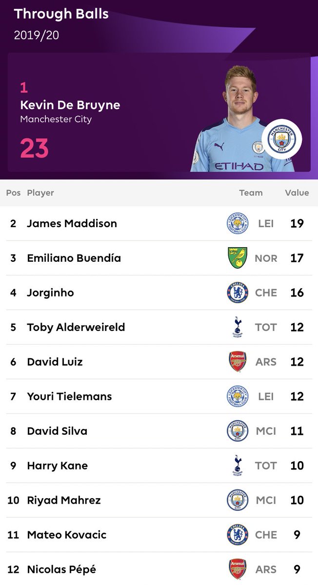 اكثر من مرر تمريرات بينية في البريميرليغ موسم 2019-2020 حتى الان /